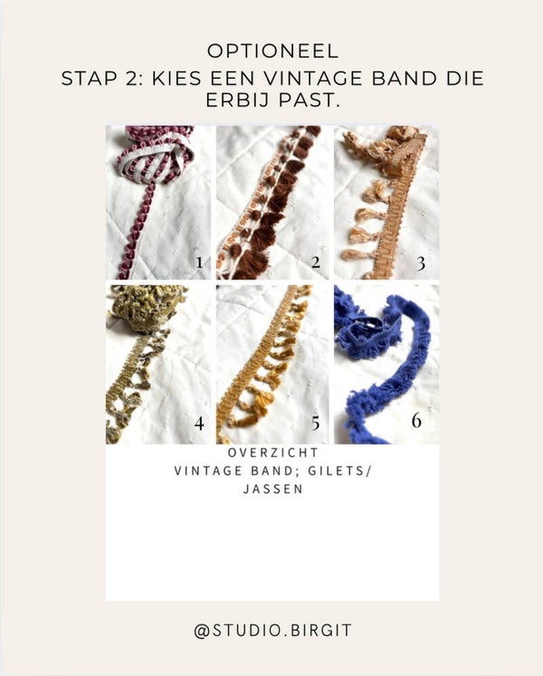 Stel jouw gilet samen Maak jouw gilet helemaal eigen. Kies eerst de kleur wol die bij jou (of je kleintje) past. Wil je iets extra’s? Voeg dan optioneel een unieke vintage band toe voor een subtiel, karaktervol detail.